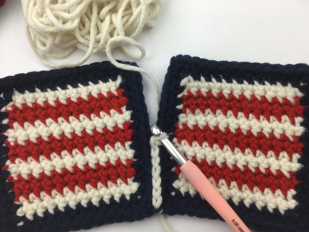 Place the yarn you are using for the join behind the work. Always keep the joining yarn behind the squares. Pick up stitches from the back of each of the two edges, as shown below.