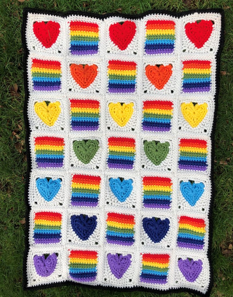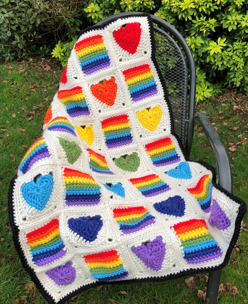 Here is a Rainbows and Hearts version of my hearts and stripes blanket. I didn’t design the original blanket this way deliberately but when I realised the striped squares have seven bars of colour I HAD to make a rainbow version ๐Ÿ™‚