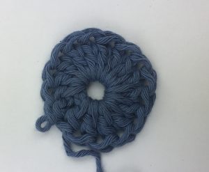 Round 2 – chain three then work 15 Tr into the centre ring.   Finish the circle by slip stitch into the third of the chain stitches you started the round with.    Check – this should give you a wheel with 16 spokes!
